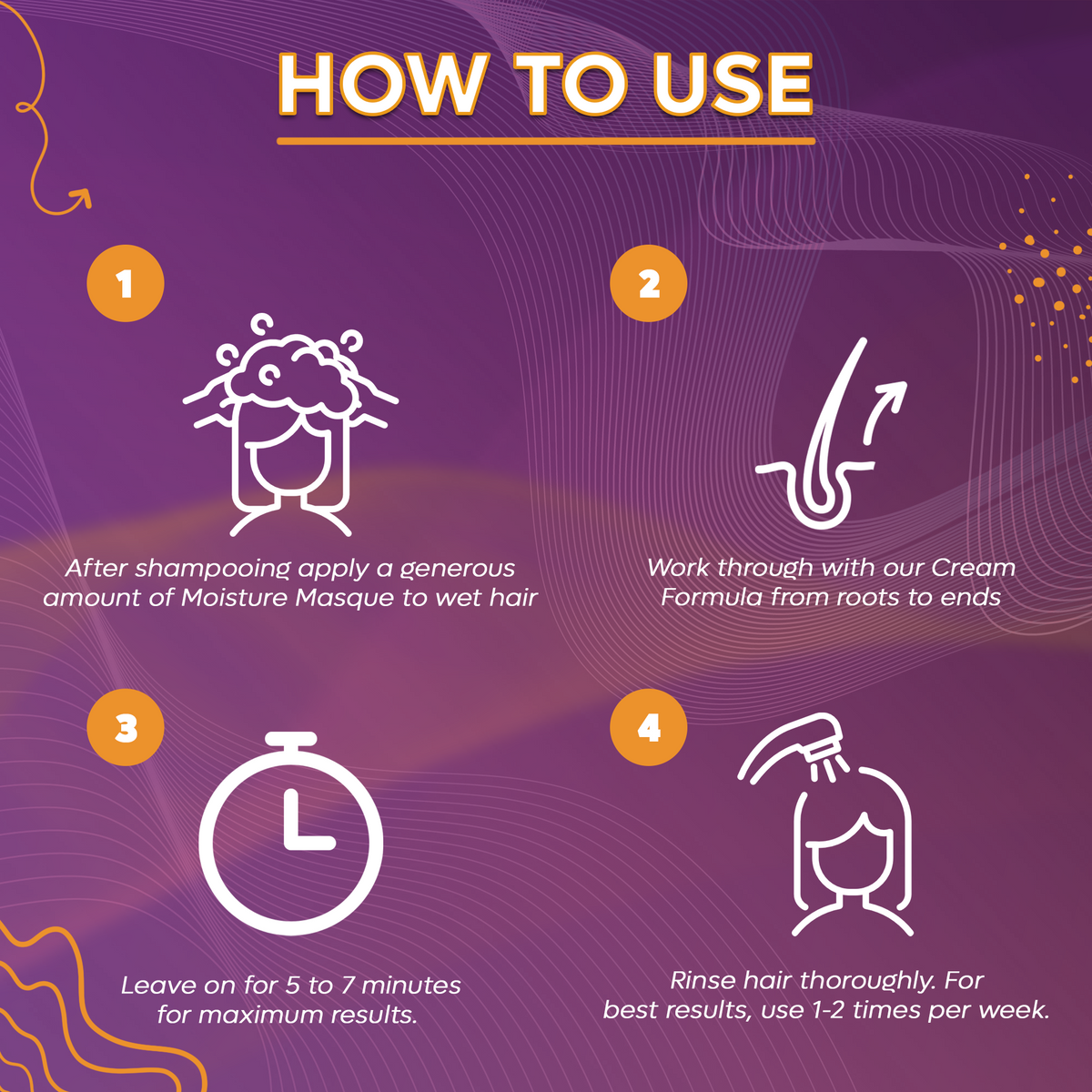 After shampooing apply a generous amount of Moisture Masque to wet hair, working through from roots to ends. Leave it on for 5 to 7 minutes for maximum results. Rinse hair thoroughly.For best results, use 1-2 times per week.